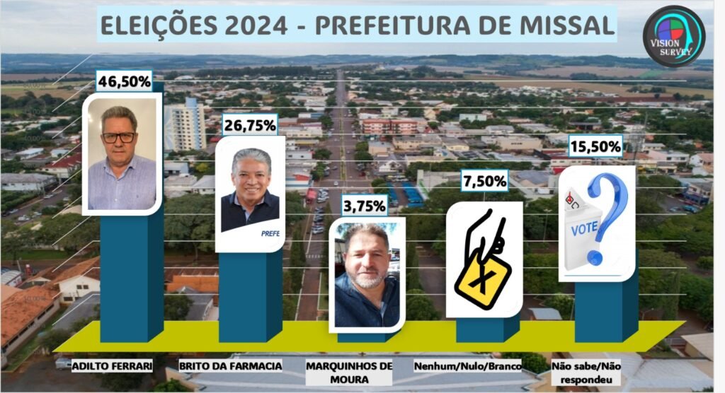A pesquisa estimulada foi divulgada hoje pelo Instituto Vision Survey e traz na segunda colocação o pré-candidato Brito da Farmácia (MDB), com 26,75% e Marquinhos de Moura (PV), com 3,75%. Brancos e nulos (7,50%), e Não sabe ou não respondeu (15,50%).